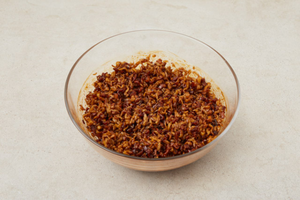 Dùng kéo cắt nhỏ sợi mì tương đen đã nấu, sau đó trộn đều cùng cơm để tạo phần cơm nắm.