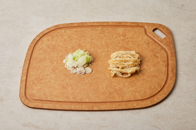 Bước 1: Sơ chế nguyên liệu Hành baro rửa sạch, thái nhỏ. Đậu phụ chiên (yubu) thái thành những sợi mỏng vừa ăn để dễ thấm nước dùng,.