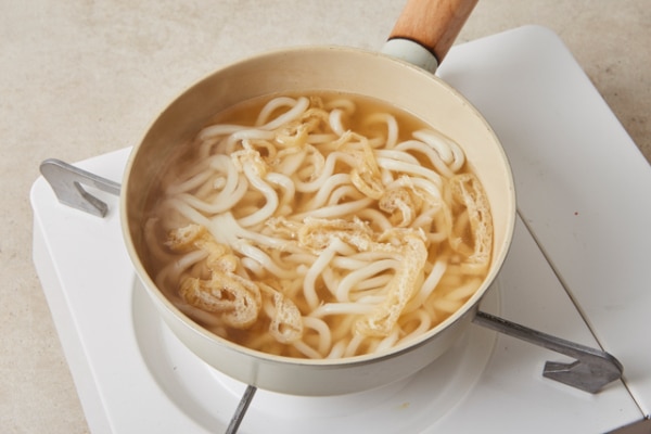 Bước 3: Nấu mì Đun sôi hỗn hợp nước dùng đã pha. Khi nước sôi, cho vắt Mì Udon Otoki và đậu phụ thái sợi vào nồi. Nấu trong khoảng từ 3 đến 5 phút để sợi mì chín tới, giữ được độ dai đặc trưng,.